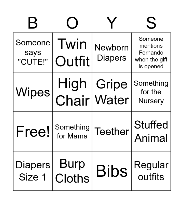 This bingo card has 20 words: Stuffed Animal, Shampoo or Soap, Newborn Diapers, Something for the tub, Diapers Size 1, Wipes, Burp Cloths, Someone says "CUTE!", Free!, Twin Outfit, Something for Mama, Teether, High Chair, Regular outfits, Gripe Water, Crib Bedding, Something for the Nursery, Someone mentions Fernando when the gift is opened, Bibs and Toys.
