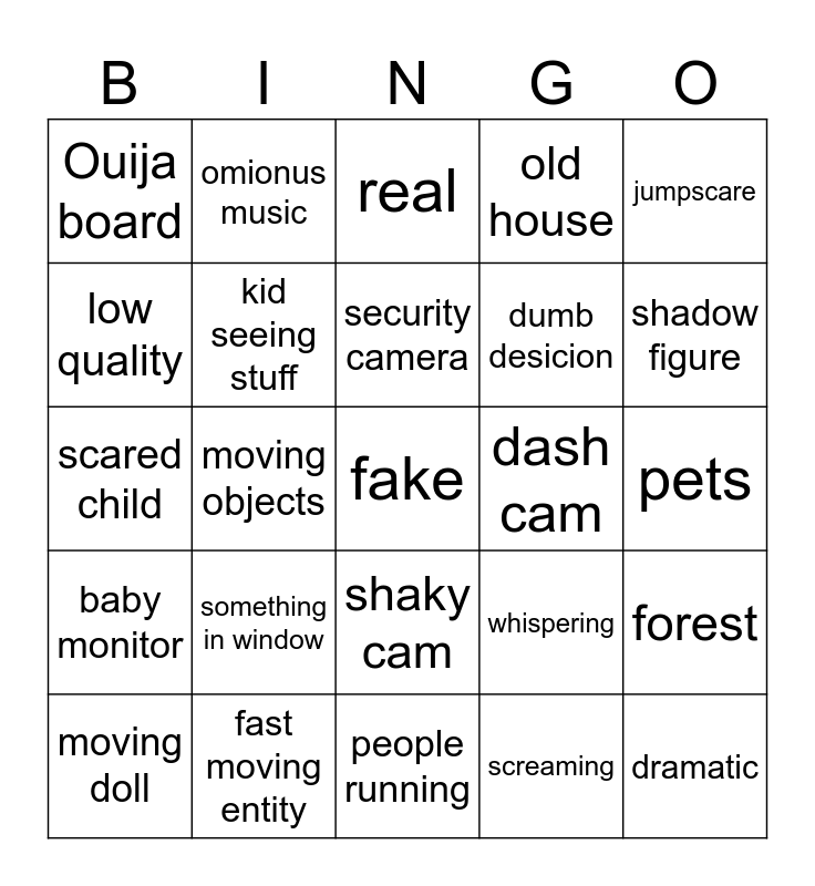 This bingo card has a free space and 24 words: something in window, fast moving entity, security camera, moving doll, jumpscare, Ouija board, low quality, omionus music, dash cam, shaky cam, dumb desicion, scared child, whispering, forest, kid seeing stuff, screaming, pets, real, shadow figure, moving objects, dramatic, baby monitor, old house and people running.