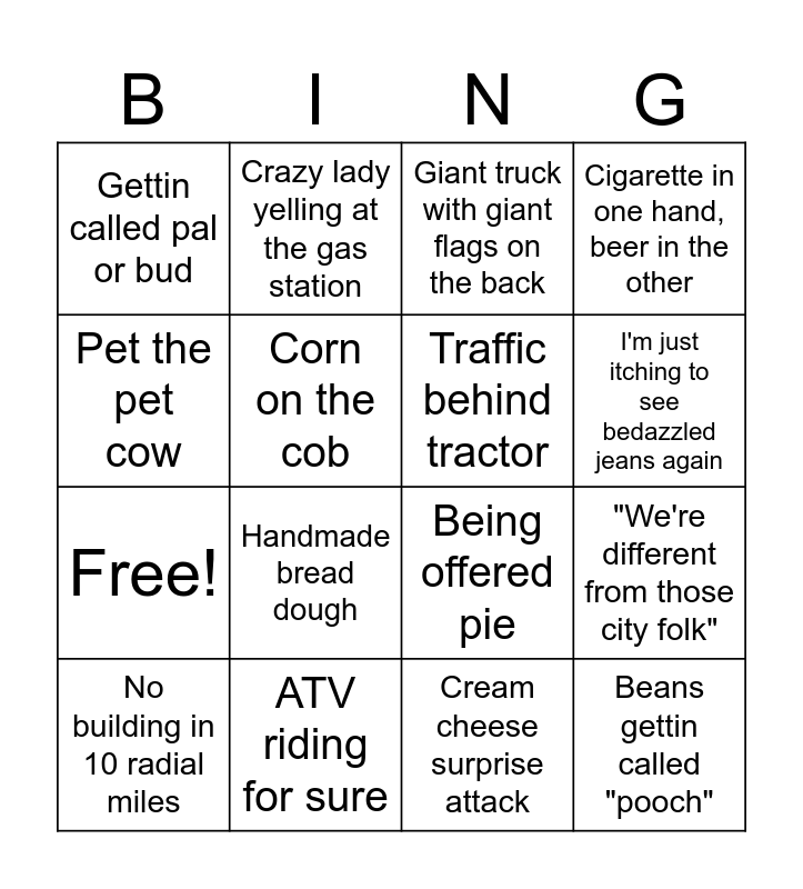 This bingo card has 20 words: "We're different from those city folk", Some dude fishing in a fishless lake, Giant truck with giant flags on the back, Something something Kansas rivalry, No building in 10 radial miles, Pet the pet cow, ATV riding for sure, Gettin called pal or bud, Free!, Crazy lady yelling at the gas station, Handmade bread dough, Being offered pie, Corn on the cob, Beans gettin called "pooch", Traffic behind tractor, American Eagle FREEDOM shirt, I'm just itching to see bedazzled jeans again, Cigarette in one hand, beer in the other, Cream cheese surprise attack and Getting chased by a pack of leashless dogs.