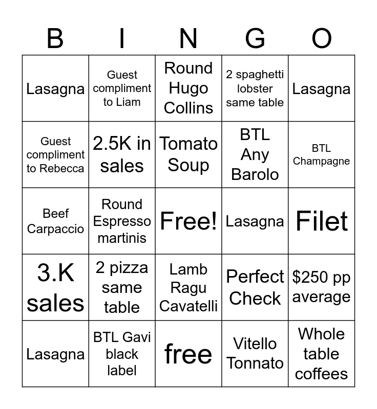 This bingo card has a free space and 24 words: 2 pizza same table, BTL Gavi black label, Tomato Soup, Lasagna, Lasagna, Lasagna, Guest compliment to Rebecca, Guest compliment to Liam, Lasagna, Lamb Ragu Cavatelli, BTL Any Barolo, Beef Carpaccio, Perfect Check, $250 pp average, 2.5K in sales, Vitello Tonnato, Filet, Round Hugo Collins, BTL Champagne, Round Espresso martinis, Whole table coffees, 3.K sales, 2 spaghetti lobster same table and free.