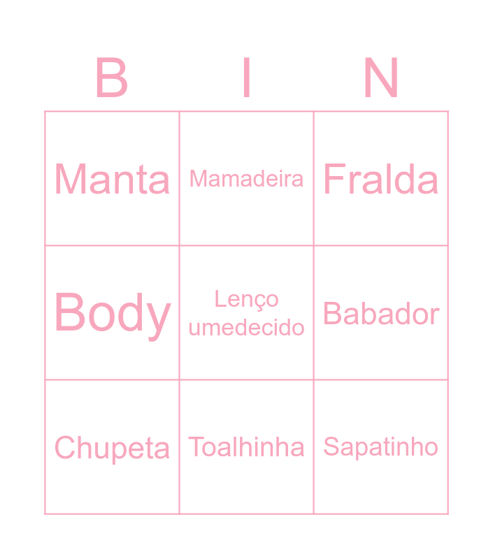 This bingo card has 9 words: Chupeta, Fralda, Mamadeira, Body, Manta, Babador, Lenço umedecido, Sapatinho and Toalhinha.