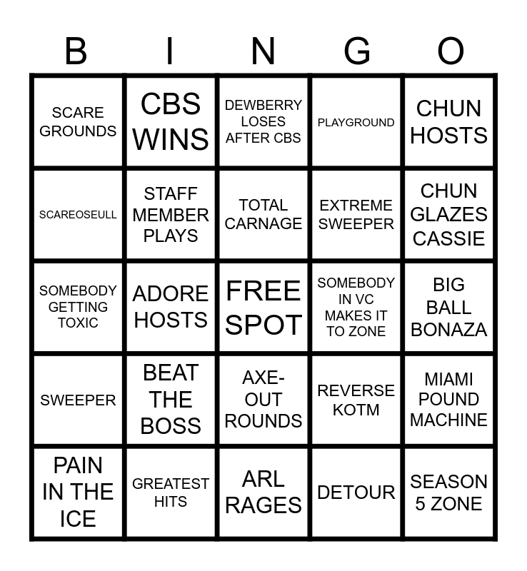 This bingo card has a free space and 24 words: BEAT THE BOSS, GREATEST HITS, TOTAL CARNAGE, PAIN IN THE ICE, CHUN HOSTS, SCARE GROUNDS, SCAREOSEULL, CBS WINS, SOMEBODY IN VC MAKES IT TO ZONE, AXE-OUT ROUNDS, EXTREME SWEEPER, SOMEBODY GETTING TOXIC, REVERSE KOTM, MIAMI POUND MACHINE, STAFF MEMBER PLAYS, DETOUR, BIG BALL BONAZA, DEWBERRY LOSES AFTER CBS, CHUN GLAZES CASSIE, ADORE HOSTS, SEASON 5 ZONE, SWEEPER, PLAYGROUND and ARL RAGES.