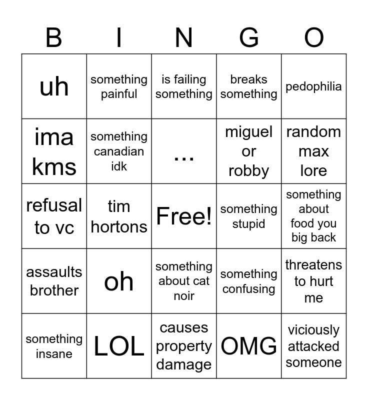 This bingo card has a free space and 24 words: oh, LOL, ..., something insane, pedophilia, uh, ima kms, something painful, something stupid, something about cat noir, miguel or robby, refusal to vc, something confusing, threatens to hurt me, something canadian idk, OMG, something about food you big back, is failing something, random max lore, tim hortons, viciously attacked someone, assaults brother, breaks something and causes property damage.
