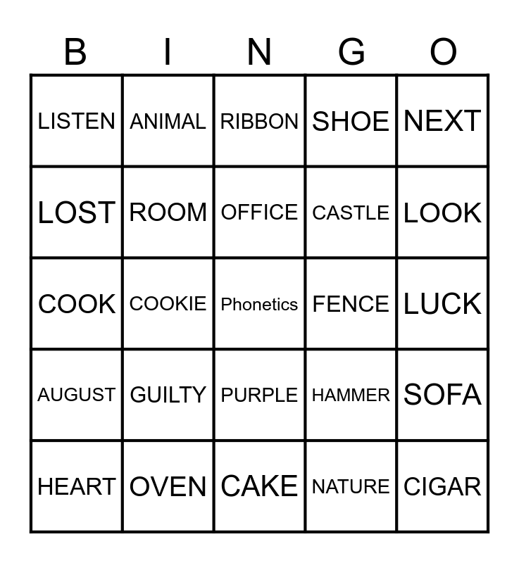 This bingo card has a free space and 130 words: AMAZE, ANIMAL, ASTRONAUT, APPLE, APRIL, ARM, AUGUST, BALLOON, BANANA, BED, BLACK, BLOCK, BOAT, BOSS, BRIDE, BRUSH, CAKE, CANOE, CANYON, CARROT, CASH, CASTLE, CAT, CHAIR, CHEAP, CHERRY, CIGAR, CIGARETTE, CIRCUS, CLASSES, COOK, COOKIE, COVER, DEAD, DEEP, DIPHTHONGS, DOG, EAST, EGGS, FATHER, FENCE, FICTION, FINGER, FOOD, FOOT, GIRL, GLASS, GUILTY, GYM, HAMMER, HAT, HEART, HELLO, HERB, HONEST, HUG, ILLUSION, INK, JAW, KEY, KISS, LADDER, LAMP, LAWYER, LEARN, LISTEN, LOAN, LOCK, LOOK, LOST, LOVE, LUCK, MASSAGE, MEASURE, MECHANIC, MINUTE, MISS, MONEY, MOUTH, NATION, NATURE, NEXT, OBAY, OCEAN, OFFICE, ONION, OVEN, PIG, PILLOW, PLAY, POLICE, PREFER, PURPLE, PUT, PUZZLE, RABBIT, RAIN, RIBBON, ROOM, ROUGE, RULER, SALAD, SHOE, SING, SNOW, SODA, SOFA, SOLDIER, STRAW, SUGAR, SUMMER, SUPPER, SUPPOSE, TABLE, THEORY, TREE, UGLY, UP, URBAN, VISION, VOTE, VOWELS, WALLET, WAY, WINDOW, WINTER, WOMAN, WORD, ZIPPER and ZOO.