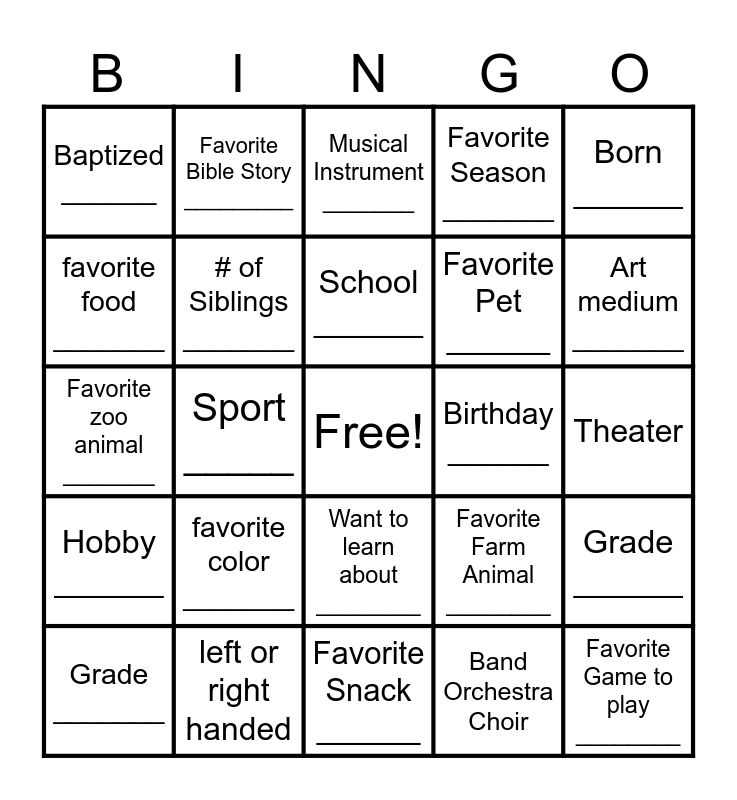 This bingo card has a free space and 24 words: favorite color _______, left or right handed, School ______, Grade _______, Born ______, Baptized ______, favorite food _______, Favorite Bible Story _________, Birthday ______, Want to learn about ________, Favorite Pet ______, Favorite zoo animal _______, Favorite Farm Animal ________, Grade ______, # of Siblings _______, Band Orchestra Choir, Theater, Musical Instrument _______, Art medium _______, Sport _____, Favorite Game to play ________, Hobby ______, Favorite Season _______ and Favorite Snack ______.