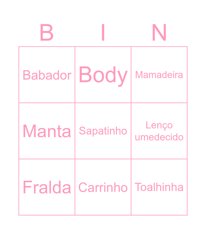 This bingo card has 9 words: Fralda, Mamadeira, Body, Manta, Babador, Lenço umedecido, Sapatinho, Toalhinha and Carrinho.