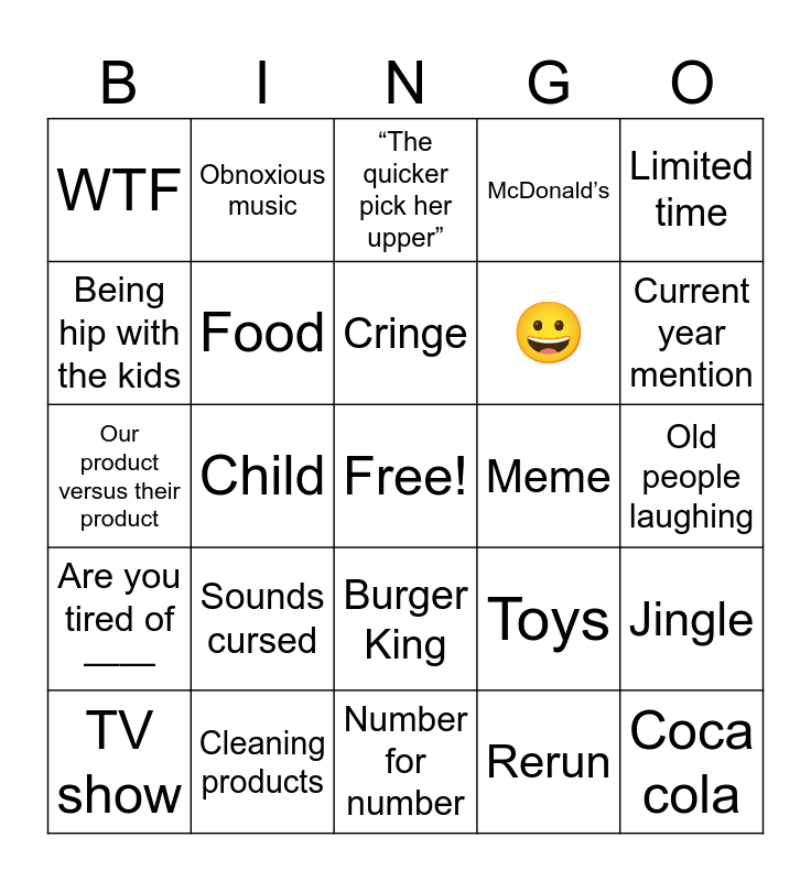 This bingo card has a free space and 24 words: Sounds cursed, Cleaning products, Cringe, TV show, Limited time, WTF, Being hip with the kids, Obnoxious music, Meme, Burger King, 😀, Our product versus their product, Toys, Jingle, Food, Rerun, Old people laughing, “The quicker pick her upper”, Current year mention, Child, Coca cola, Are you tired of ——, McDonald’s and Number for number.