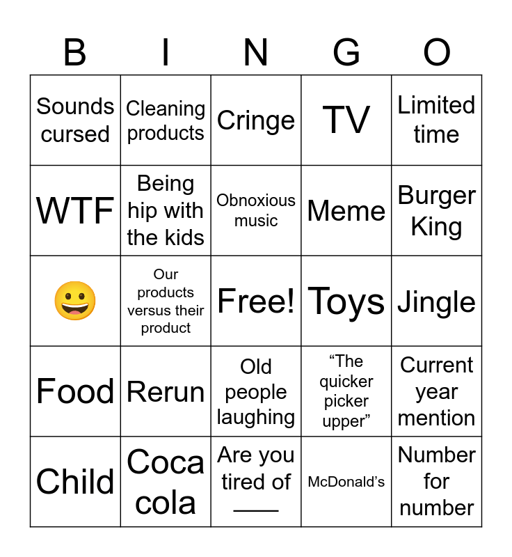 This bingo card has a free space and 24 words: Rerun, Coca cola, Obnoxious music, Child, Limited time, Sounds cursed, WTF, Cleaning products, Toys, Old people laughing, Meme, 😀, “The quicker picker upper”, Current year mention, Being hip with the kids, McDonald’s, Jingle, Cringe, Burger King, Our products versus their product, Number for number, Food, TV and Are you tired of ——.
