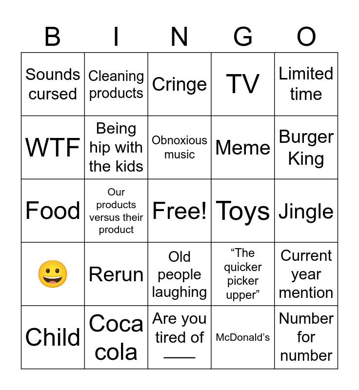 This bingo card has a free space and 24 words: Rerun, Coca cola, Obnoxious music, Child, Limited time, Sounds cursed, WTF, Cleaning products, Toys, Old people laughing, Meme, Food, “The quicker picker upper”, Current year mention, Being hip with the kids, McDonald’s, Jingle, Cringe, Burger King, Our products versus their product, Number for number, 😀, TV and Are you tired of ——.