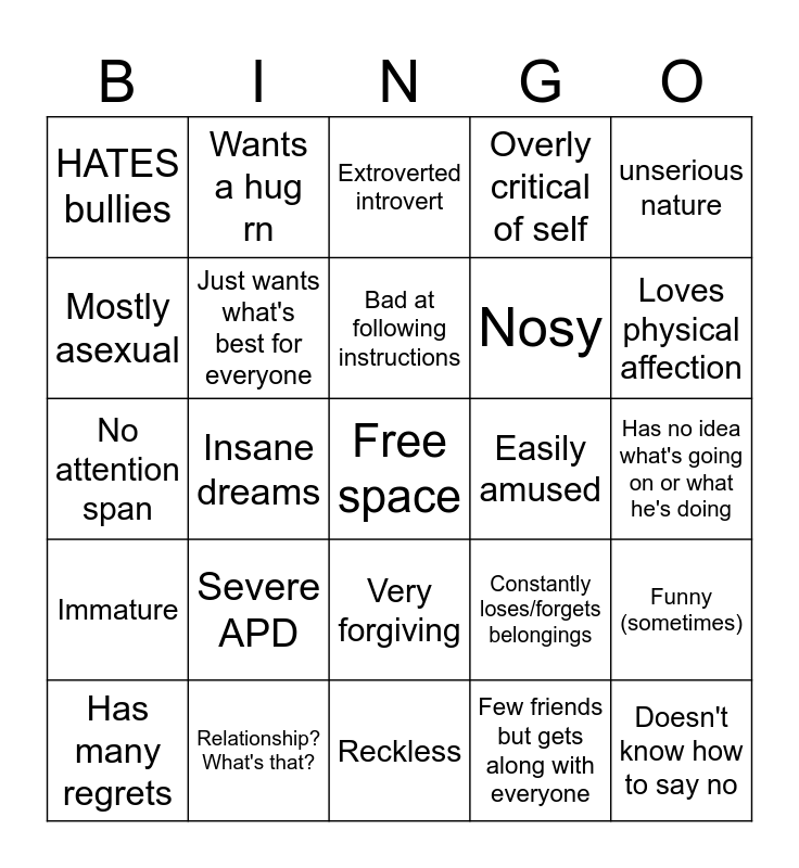 This bingo card has a free space and 24 words: Severe APD, Relationship? What's that?, Bad at following instructions, Has many regrets, unserious nature, HATES bullies, Mostly asexual, Wants a hug rn, Easily amused, Very forgiving, Nosy, No attention span, Constantly loses/forgets belongings, Funny (sometimes), Just wants what's best for everyone, Few friends but gets along with everyone, Has no idea what's going on or what he's doing, Extroverted introvert, Loves physical affection, Insane dreams, Doesn't know how to say no, Immature, Overly critical of self and Reckless.