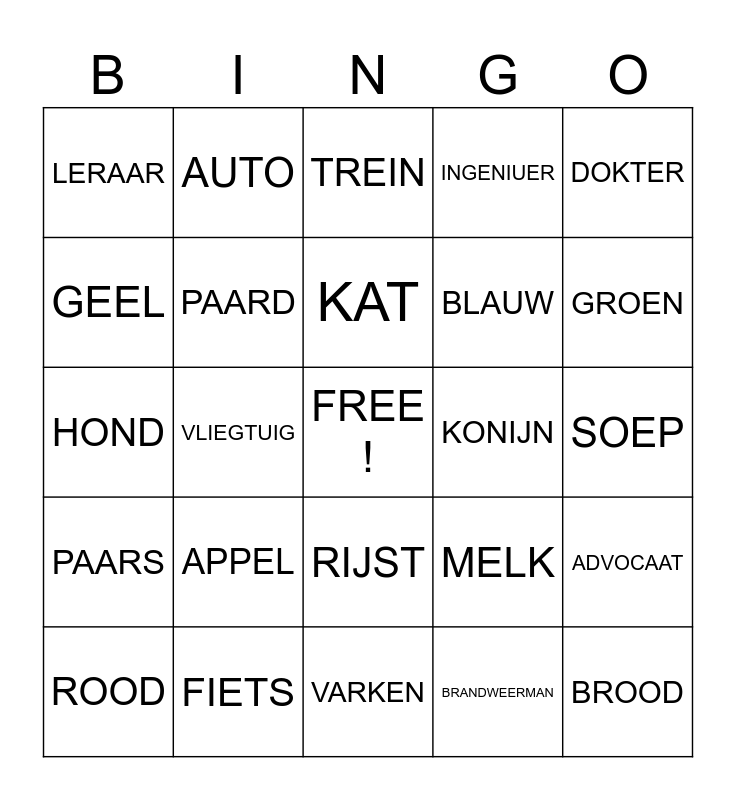 This bingo card has a free space and 24 words: APPEL, FIETS, KAT, ROOD, DOKTER, LERAAR, GEEL, AUTO, KONIJN, RIJST, BLAUW, HOND, MELK, ADVOCAAT, PAARD, BRANDWEERMAN, SOEP, TREIN, GROEN, VLIEGTUIG, BROOD, PAARS, INGENIUER and VARKEN.