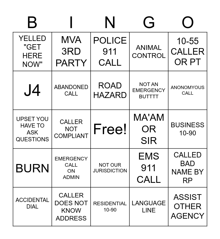 This bingo card has a free space and 24 words: EMERGENCY CALL ON ADMIN, CALLER DOES NOT KNOW ADDRESS, ROAD HAZARD, ACCIDENTAL DIAL, 10-55 CALLER OR PT, YELLED "GET HERE NOW", J4, MVA 3RD PARTY, MA'AM OR SIR, NOT OUR JURISDICTION, NOT AN EMERGENCY BUTTTT, UPSET YOU HAVE TO ASK QUESTIONS, EMS 911 CALL, CALLED BAD NAME BY RP, ABANDONED CALL, LANGUAGE LINE, BUSINESS 10-90, POLICE 911 CALL, ANONOMYOUS CALL, CALLER NOT COMPLIANT, ASSIST OTHER AGENCY, BURN, ANIMAL CONTROL and RESIDENTIAL 10-90.