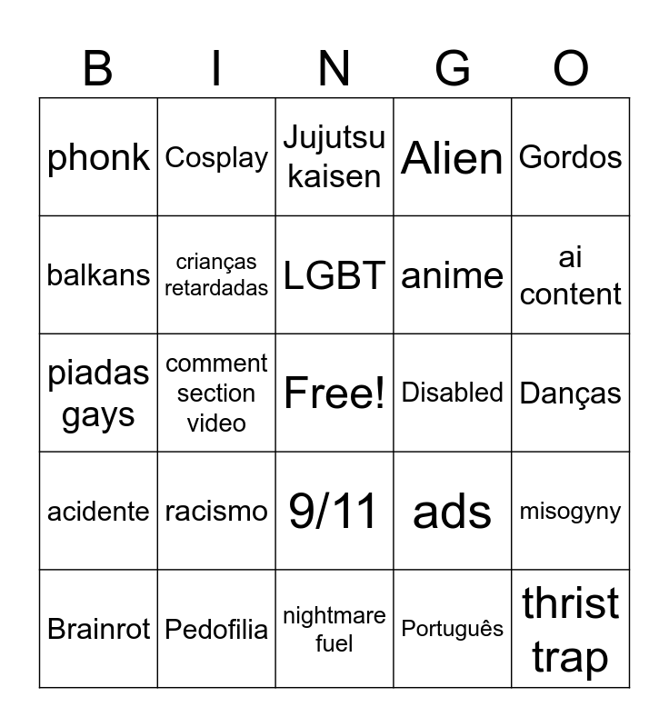 This bingo card has a free space and 24 words: racismo, Pedofilia, LGBT, Brainrot, Gordos, phonk, balkans, Cosplay, Disabled, 9/11, anime, piadas gays, ads, misogyny, crianças retardadas, Português, Danças, Jujutsu kaisen, ai content, comment section video, thrist trap, acidente, Alien and nightmare fuel.