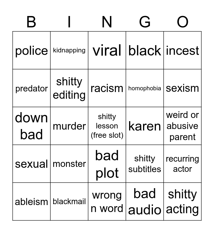 This bingo card has a free space and 24 words: monster, blackmail, racism, ableism, incest, police, predator, kidnapping, karen, bad plot, homophobia, down bad, shitty subtitles, recurring actor, shitty editing, bad audio, weird or abusive parent, viral, sexism, murder, shitty acting, sexual, black and wrong n word.