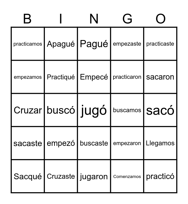 This bingo card has a free space and 39 words: Busqué, buscaron, Jugué, Practiqué, Sacqué, buscaste, Empecé, jugaste, practicaste, sacaste, buscó, empezaste, practicó, sacó, buscamos, empezó, jugamos, practicamos, sacamos, empezaron, empezamos, jugaron, practicaron, sacaron, llegar, Almorzaron, Cruzamos, Empezar, Toqué, Apagué, Crucé, Pescar, Pagué, Cruzaste, Comenzamos, Almorzó, Llegamos, Cruzar and llegó.