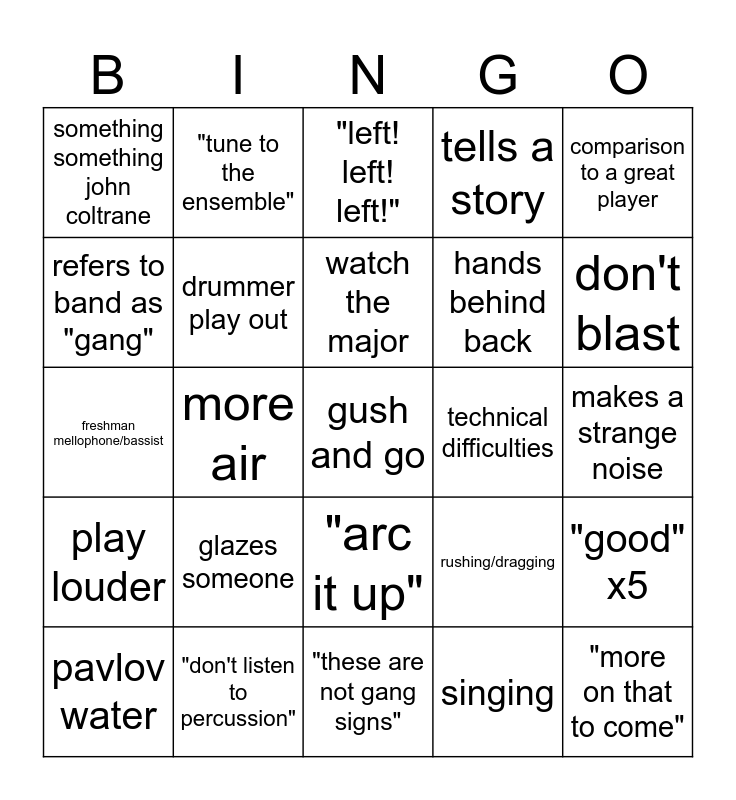 This bingo card has a free space and 31 words: "these are not gang signs", drops something, more air, level system, something something john coltrane, "left! left! left!", drummer play out, rushing/dragging, technical difficulties, singing, makes a strange noise, "more on that to come", "do you have this in your music as well", ____types, don't blast, CUT, "good" x5, glazes someone, play louder, "arc it up", comparison to a great player, feet mentioned, pavlov water, "tune to the ensemble", hands behind back, refers to band as "gang", tells a story, freshman mellophone/bassist, "don't listen to percussion", watch the major and "those are the words".