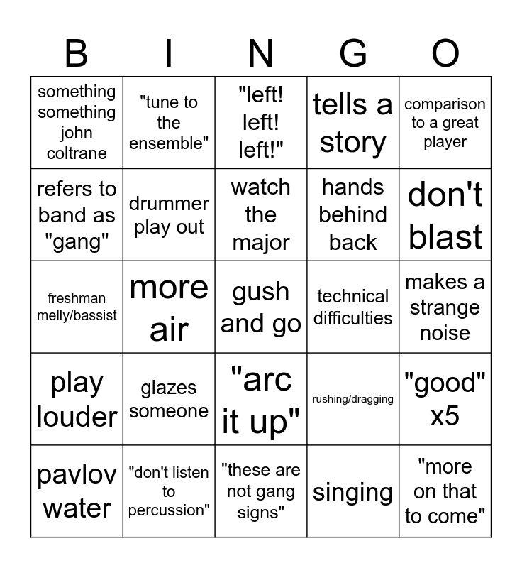 This bingo card has a free space and 31 words: "these are not gang signs", drops something, more air, level system, something something john coltrane, "left! left! left!", drummer play out, rushing/dragging, technical difficulties, singing, makes a strange noise, "more on that to come", "do you have this in your music as well", ____types, don't blast, CUT, "good" x5, glazes someone, play louder, "arc it up", comparison to a great player, feet mentioned, pavlov water, "tune to the ensemble", hands behind back, refers to band as "gang", tells a story, freshman melly/bassist, "don't listen to percussion", watch the major and "those are the words".