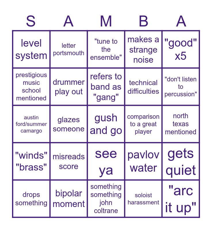 This bingo card has a free space and 57 words: "these are not gang signs", drops something, more air, level system, something something john coltrane, "left! left! left!", drummer play out, rushing/dragging, technical difficulties, singing, makes a strange noise, "more on that to come", "do you have this in your music as well", ____types, don't blast, CUT, "good" x5, glazes someone, play louder, "arc it up", comparison to a great player, feet mentioned, pavlov water, "tune to the ensemble", hands behind back, refers to band as "gang", tells a story, freshman melly/bassist, "don't listen to percussion", watch the major, "those are the words", starts counting, drum corps video, nyo jazz video, north texas mentioned, prestigious music school mentioned, HOSCH, austin ford/summer camargo, brasses on mouthpieces, "winds" "brass", letter portsmouth, see ya, "hit it and get out of there", freddie hubbard mentioned, all out, dementia moment, misreads score, bipolar moment, dig in, bring it in, randomly says student's name, soloist harassment, marching band mention in class, pause and "yeahhhh", falsetto voice + "make sure...", gets quiet and edges us.
