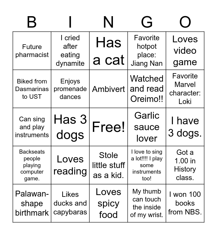 This bingo card has a free space and 29 words: Palawan-shape birthmark, Special number: 19, Has 3 dogs, 100 books, Future pharmacist, Has a cat, Enjoys promenade dances, Loves reading, Garlic sauce lover, Likes ducks and capybaras, I have 3 dogs., I won 100 books from NBS., Loves spicy food, My thumb can touch the inside of my wrist., Favorite Marvel character: Loki, Dogs over cats, Stole little stuff as a kid., Backseats people playing computer game., Loves video game, Can sing and play instruments, I love to sing a lot!!!! I play some instruments too!, Kissed a man and a woman., Watched and read Oreimo!!, Biked from Dasmarinas to UST, Favorite hotpot place: Jiang Nan, I cried after eating dynamite, Got a 1.00 in History class., Ambivert and Has a jolly personality..