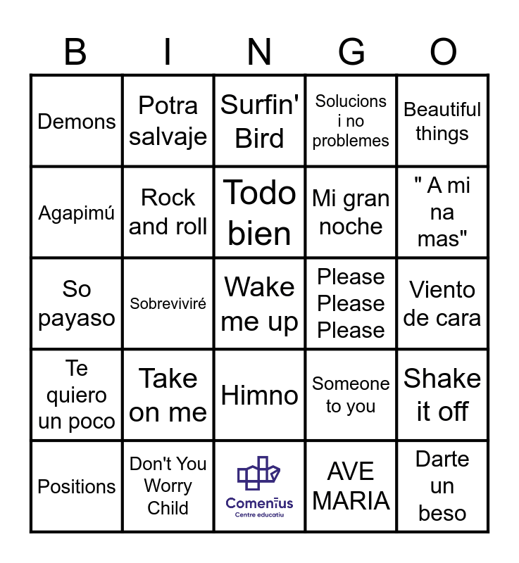 This bingo card has 5 images and 81 words: I follow rivers, El fin del mundo, Champagne, I wanna be your slave, Dragostea din tei, La mujer de verd, Over the Rainbow, MEDITERRÁNEO, Someone to you, I´ll come crashing", So payaso, Sobreviviré, Ahora te puedes marchar, Turnedo, La reina, Escuela de calor, Take on me, Wake me up, Pégate, Shake it off, Contigo, Mediterrània, Have your ever seen the rain, Por la raja de tu falda, With or without you', Positions, Camals Mullats, El principio de algo, AVE MARIA, Beautiful things, Instrucciones para bailar un vals, Rock and roll, Gimme! Gimme! Gimme!, A mi manera, Viento de cara, Foto en blanco y negro, Don't You Worry Child, Chiquilla, Please Please Please, Sufre mamón, Agapimú, Amigos, Surfin' Bird, 23 de Junio, This mess we're in, Empire state of mind, Venècia sin ti, Himno, En el coche, Sta Guai, Tobogan, Si antes te hubiera conocido, Todo bien, Solucions i no problemes, " A mi na mas", Demons, La vida sense tu, Take on me, A quién le importa, Texas Hold’en, Potra salvaje, Búscate un hombre que te quiera, Mi gran noche, Darte un beso, Salta, Física o química, La casa por el tejado, Livin’g on Prayer, The final Countdown, No hay tregua, Thunderstruck, Chas! Y aparezco a tu lado, Single Ladies, Soy yo, Clavaito, Maníaca, La revolución sexual, YMCA, Cuando zarpa el amor, Te quiero un poco and No puedo vivir sin tí.