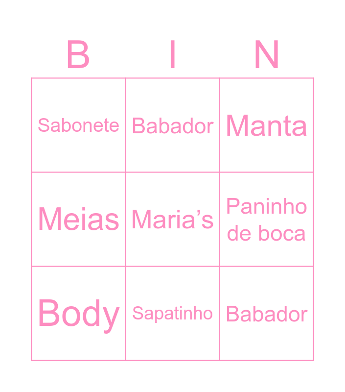 This bingo card has 9 words: Body, Manta, Babador, Meias, Sabonete, Paninho de boca, Maria’s, Babador and Sapatinho.