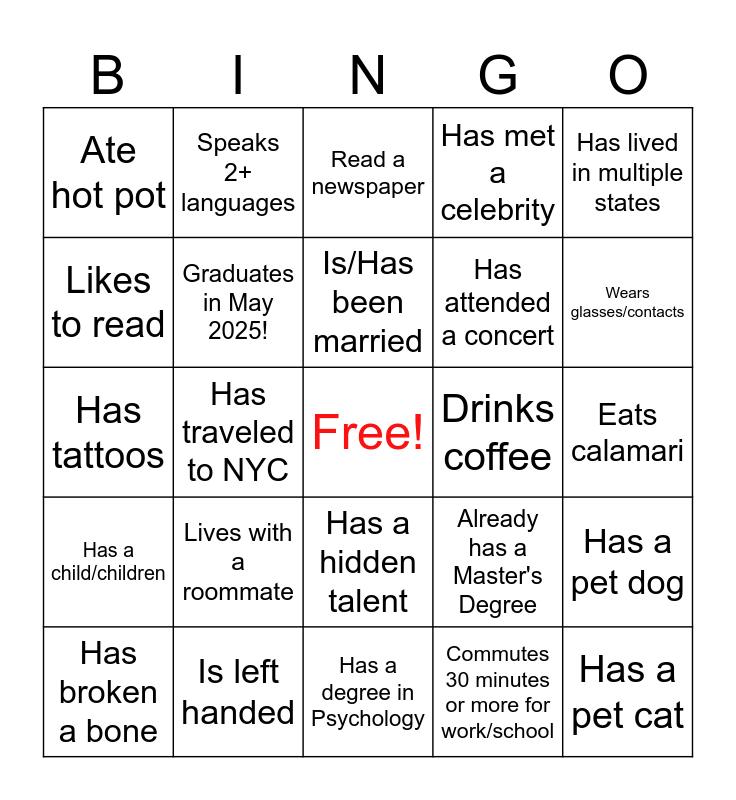 This bingo card has a free space and 34 words: Can do a backflip, Commutes 30 minutes or more for work/school, Has traveled abroad, Eats sushi, Has a child/children, Graduates in May 2025!, Has lived in multiple states, Has broken a bone, Speaks 2+ languages, Never flown on an airplane, Is/Has been married, Read a newspaper, Ran in a marathon, Has 0 unopened emails, Drinks coffee, Wears glasses/contacts, Is left handed, Has tattoos, Lives with a roommate, Already has a Master's Degree, Has a hidden talent, Owns a Chevy, Ate hot pot, Eats calamari, Has a degree in Psychology, Has a pet cat, Has met a celebrity, Never learned to swim, Has attended a concert, Likes to read, Has been bungee jumping/ skydiving, Has traveled to NYC, Has a pet dog and Has lived in Texas.