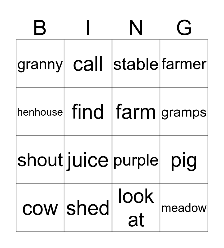 This bingo card has a free space and 15 words: cow, meadow, stable, granny, gramps, henhouse, juice, look at, find, shout, pig, farmer, farm, call and shed.