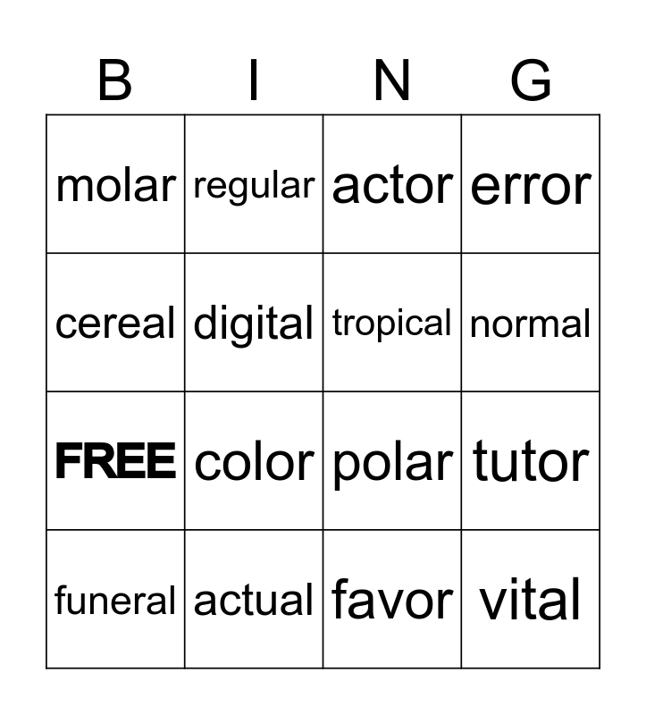 This bingo card has 25 words: solar, lunar, polar, vulgar, molar, regular, actor, error, FREE, color, favor, tutor, honor, actual, tropical, rural, funeral, digital, animal, vital, cereal, local, plural, normal and fatal.