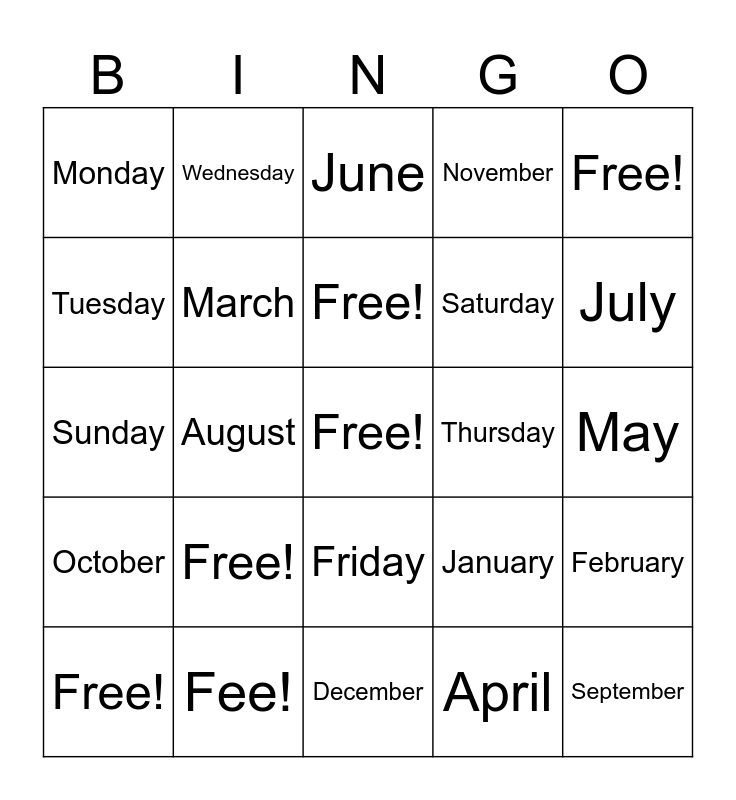 This bingo card has a free space and 24 words: Free!, Fee!, Free!, Free!, Free!, Monday, Tuesday, Wednesday, Thursday, Friday, Saturday, Sunday, January, February, March, April, May, June, July, August, September, October, November and December.