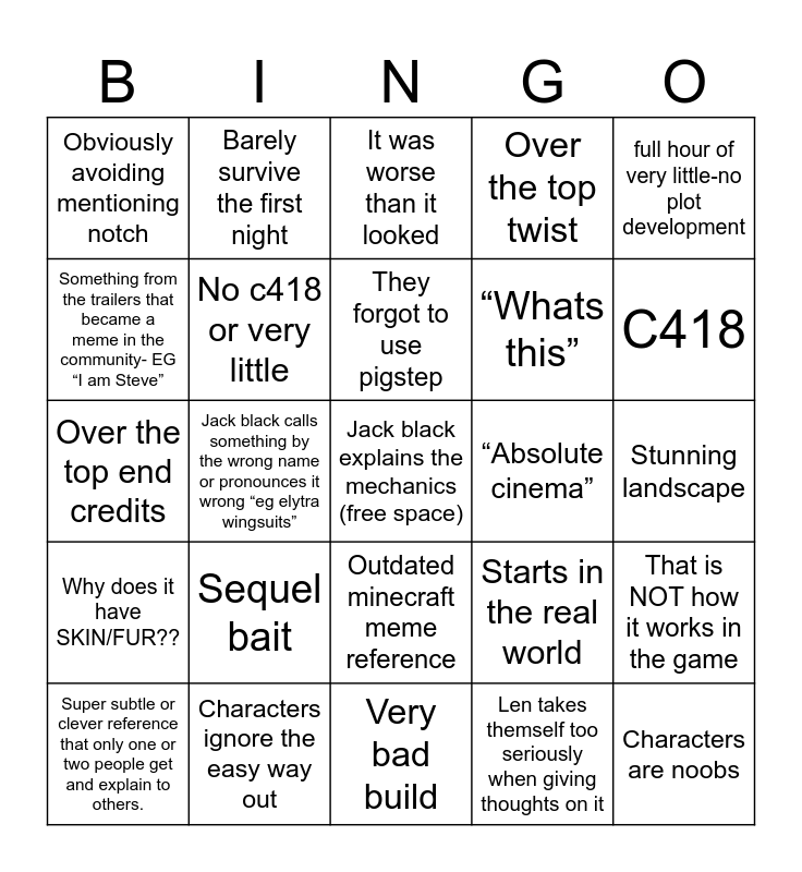 This bingo card has a free space and 34 words: Jack black sings, Len takes themself too seriously when giving thoughts on it, Herobrine reference, Youtuber, Why does it have SKIN/FUR??, No c418 or very little, full hour of very little-no plot development, Super subtle or clever reference that only one or two people get and explain to others., Barely survive the first night, Unnecessary Needle drop, They forgot to use pigstep, It was worse than it looked, It was better than it looked, Outdated feature, “Absolute cinema”, C418, Characters ignore the easy way out, Over the top end credits, Sequel bait, Starts in the real world, Outdated minecraft meme reference, Minecraft parody/popular fan song, Obviously avoiding mentioning notch, Stunning landscape, Very bad build, Characters are noobs, Over the top twist, “He’s right behind me isn’t he” or other cliche line- eg “I got it! I got ! I don’t got it!”, “Whats this”, Something from the trailers that became a meme in the community- EG “I am Steve”, Just use the elytra!, Jack black calls something by the wrong name or pronounces it wrong “eg elytra wingsuits”, That is NOT how it works in the game and Small issue one of us complains about a ton.