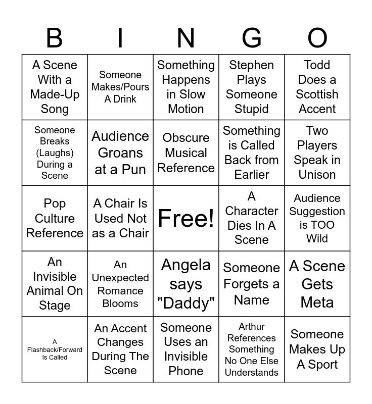 This bingo card has a free space and 26 words: Angela says "Daddy", Arthur References Something No One Else Understands, Obscure Musical Reference, An Accent Changes During The Scene, Todd Does a Scottish Accent, A Scene With a Made-Up Song, Someone Breaks (Laughs) During a Scene, Someone Makes/Pours A Drink, Audience Suggestion is TOO Wild, Someone Forgets a Name, Something is Called Back from Earlier, Pop Culture Reference, A Scene Gets Meta, A Flashback/Forward Is Called, A Chair Is Used Not as a Chair, Someone Makes an Unclear Sound Effect, Stephen Plays Someone Stupid, An Invisible Animal On Stage, Something Happens in Slow Motion, Someone Makes Up A Sport, Two Players Speak in Unison, Someone Uses an Invisible Phone, A Character Dies In A Scene, An Unexpected Romance Blooms, Audience Groans at a Pun and Bad Celebrity Impression.