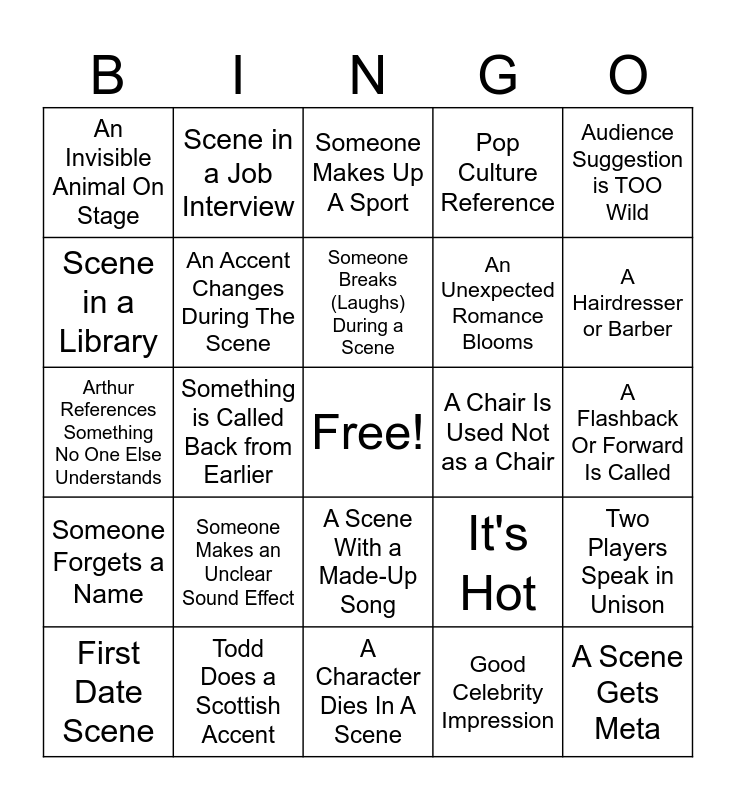 This bingo card has a free space and 41 words: Angela says "Daddy", Arthur References Something No One Else Understands, Obscure Musical Reference, An Accent Changes During The Scene, Todd Does a Scottish Accent, A Scene With a Made-Up Song, Someone Breaks (Laughs) During a Scene, Someone Makes/Pours A Drink, Audience Suggestion is TOO Wild, Someone Forgets a Name, Something is Called Back from Earlier, Pop Culture Reference, A Scene Gets Meta, A Flashback Or Forward Is Called, A Chair Is Used Not as a Chair, Someone Makes an Unclear Sound Effect, Stephen Plays Someone Stupid, An Invisible Animal On Stage, Something Happens in Slow Motion, Someone Makes Up A Sport, Two Players Speak in Unison, Someone Uses an Invisible Phone, A Character Dies In A Scene, An Unexpected Romance Blooms, Audience Groans at a Pun, Bad Celebrity Impression, Good Celebrity Impression, A Supernatural Character, A Hairdresser or Barber, Scene in a Restaurant, Scene in Space, Scene in a Job Interview, First Date Scene, It's Cold, It's Hot, Scene in a Library, Scene at an Airport, Someone Makes Someone Sing, The Group Is Mean to Todd, Scene with a Doctor and Scene with a Therapist.
