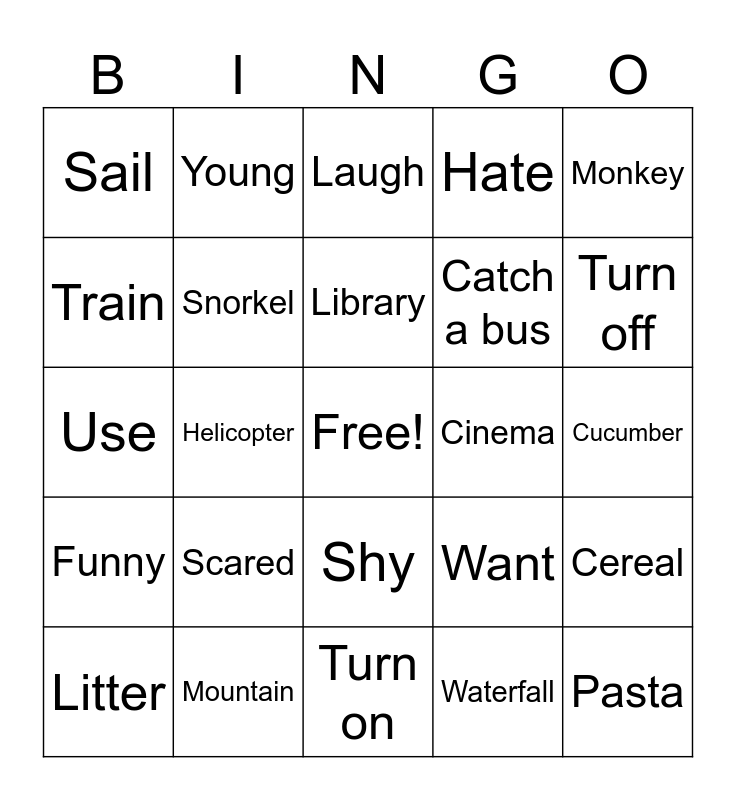 This bingo card has a free space and 29 words: The USA, Mountain, Laugh, Lizard, Monkey, Sail, Snorkel, Library, Cinema, Cereal, Litter, Helicopter, Waterfall, Pasta, Use, Play the guitar, Turn on, Want, Turn off, Funny, Scared, Have a shower, Catch a bus, Cucumber, Train, Young, Shy, Hate and Want.