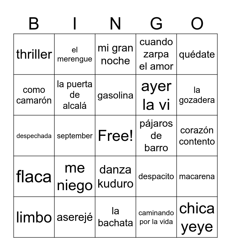 This bingo card has a free space and 35 words: ave maria, bomba, corazón partio, la puerta de alcalá, danza kuduro, cuando zarpa el amor, como camarón, quiereme, gasolina, todo de ti, despechada, quédate, me cole en una fiesta, la bicicleta, thriller, pájaros de barro, caminando por la vida, september, flaca, chica yeye, despacito, limbo, macarena, aserejé, mi gran noche, la gozadera, sarandonga, obsesión, ayer la vi, corazón contento, échame la culpa, la bachata, me niego, el merengue and waka waka.