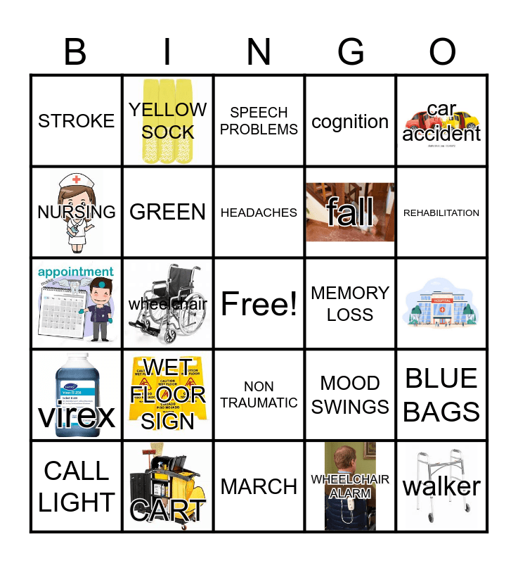 This bingo card has 24 images, a free space and 54 words: therapist, CALL LIGHT, TBI, STROKE, MARCH, REHAB, GREEN, BRAIN INJURY AWARENESS, fall, CONCUSSION, cognition, HEMATOMA, BRAIN FUNCTION, SIDE RAIL, HOURLY ROUNDING, TUMOR, car accident, wheelchair, CNA, walker, MEMORY LOSS, FATIGUE, MOOD SWINGS, SPEECH PROBLEMS, HOUSE SUPERVISOR, HEADACHES, HORMONAL IMBALANCES, EPILEPSY, REHABILITATION, RECOVERY, SUPPORTER, SURVIVOR, ANIXETY, DEPRESSION, NURSING, NEUROLOGIST, virex, YELLOW SOCK, NON TRAUMATIC, social worker, MEDICATION, GAIT BELT, sharp container, WET FLOOR SIGN, CART, YELLOW BAND, MIRCO MOPS, BROOM AND DUSTPAN, WHEELCHAIR ALARM, DANIMAP, COMPUTER ON WHEELS, HOUSEKEEPERS, BLUE BAGS and HOYER LIFT.