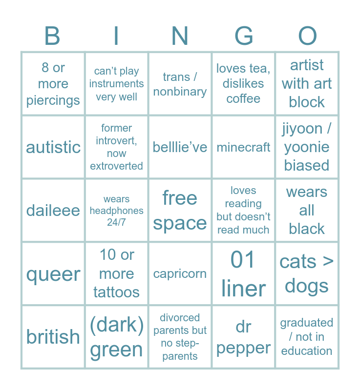 This bingo card has a free space and 24 words: british, 10 or more tattoos, belllie’ve, dr pepper, artist with art block, 8 or more piercings, can’t play instruments very well, trans / nonbinary, loves reading but doesn’t read much, wears all black, daileee, former introvert, now extroverted, 01 liner, cats > dogs, autistic, (dark) green, divorced parents but no step-parents, loves tea, dislikes coffee, jiyoon / yoonie biased, queer, wears headphones 24/7, capricorn, minecraft and graduated / not in education.