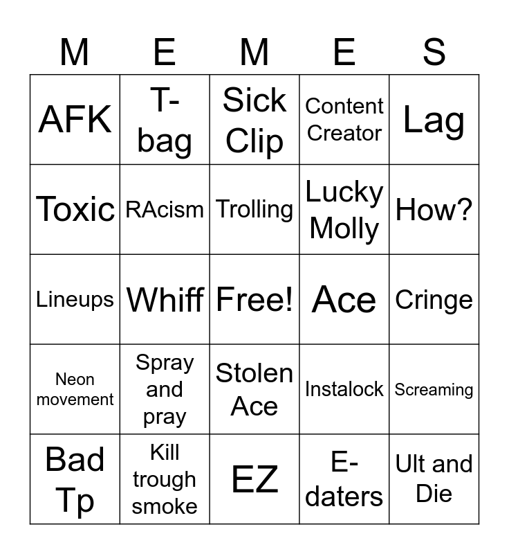 This bingo card has a free space and 24 words: Spray and pray, Kill trough smoke, Trolling, Bad Tp, Lag, AFK, Toxic, T-bag, Ace, Stolen Ace, Lucky Molly, Lineups, Instalock, Screaming, RAcism, E-daters, Cringe, Sick Clip, How?, Whiff, Ult and Die, Neon movement, Content Creator and EZ.