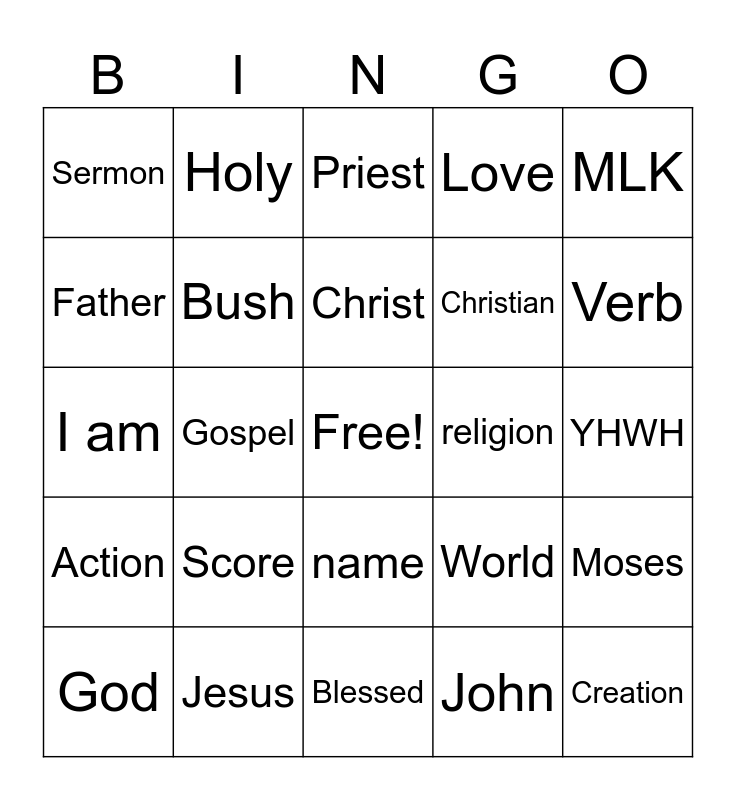 This bingo card has a free space and 24 words: Score, Jesus, Christ, God, MLK, Sermon, Father, Holy, religion, name, Christian, I am, World, Moses, Bush, John, YHWH, Priest, Verb, Gospel, Creation, Action, Love and Blessed.