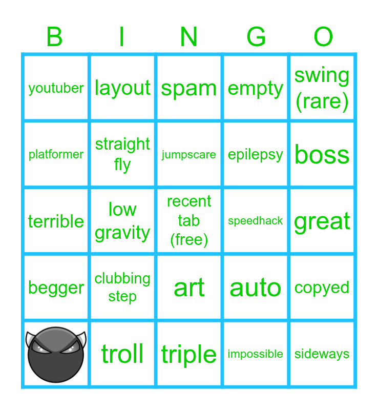 This bingo card has 1 images, a free space and 23 words: clubbing step, jumpscare, impossible, swing (rare), youtuber, layout, spam, speedhack, great, terrible, straight fly, auto, copyed, platformer, troll, triple, empty, boss, begger, low gravity, art, epilepsy and sideways.