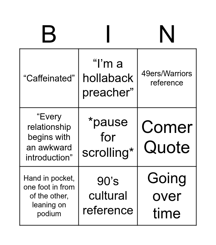 This bingo card has a free space and 8 words: Comer Quote, 49ers/Warriors reference, “I’m a hollaback preacher”, Hand in pocket, one foot in from of the other, leaning on podium, “Caffeinated”, Going over time, “Every relationship begins with an awkward introduction” and 90’s cultural reference.