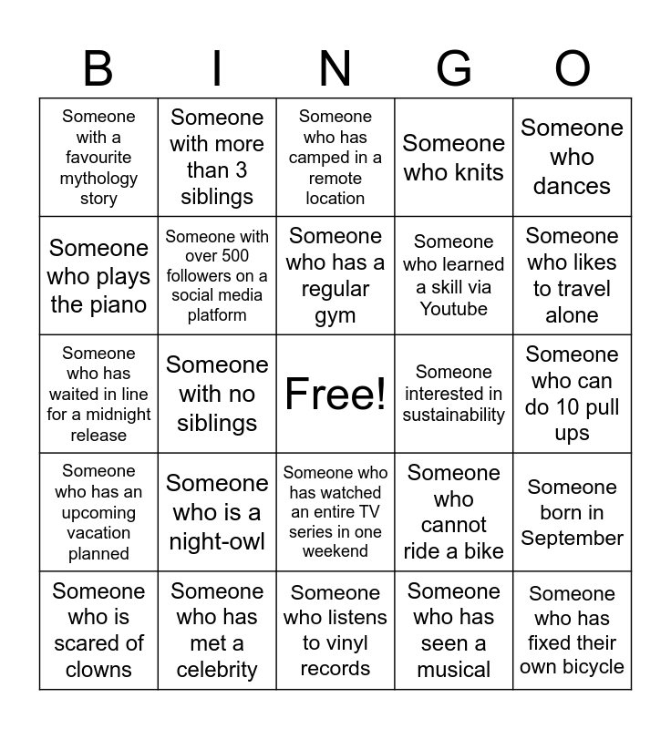This bingo card has a free space and 107 words: Someone who grew up with a pet, Someone taller than both their parents, Someone with no siblings, Someone who can sing, Someone who is terrible at singing, Someone who likes pineapple on pizza, Someone who is good at pingpong, Someone who likes winter better than summer, Someone who is vegetarian or vegan, Someone who is left-handed, Someone who is a twin, Someone who prefers tea over coffee, Someone who prefers cats over dogs, Someone who changed careers, Someone who is the oldest sibling, Someone with a child, Someone with more than 3 siblings, Someone in a book club, Someone who doesn't use social media, Someone with over 4 hours of screen time a day, Someone who is a night-owl, Someone who wakes up at 7 on weekends, Someone who hates chocolate, Someone who is in Slytherin, Someone who has never watched `Harry Potter, Someone who dances, Someone who plays the piano, Someone who knits, Someone who can do a handstand, Someone who likes to play videogames, Someone who is a terrible cook, Someone who has met a celebrity, Someone who has seen a bear, Someone who has swum with dolphins, Someone who has been in a hot air balloon, Someone who has camped in a remote location, Someone who has gone snorkeling, Someone who took a flight in the last month, Someone who has built their own computer, Someone who has fixed their own bicycle, Someone who, at some point, has made a blog, Someone who listens to audiobooks, Someone who listens to vinyl records, Someone who has taken a Coursera course, Someone with a cute pet, Someone with over 500 followers on a social media platform, Someone with an allergy, Someone who has a regular gym, Someone who tracks their daily steps, Someone interested in sustainability, Someone who has been to at least 4 continents, Someone who likes to travel alone, Someone who has an upcoming vacation planned, Someone who likes to ski, Someone who cannot drive, Someone who cannot tell their right from their left, Someone with a bucket list travel spot, Someone who took a history course for fun, Someone who has taken a foreign cooking class, Someone with a favourite mythology story, Someone who has been to New York, Someone who carries a lucky charm, Someone who likes doing puzzles, Someone with a favourite poem, Someone with a favourite quote, Someone who watches sports, Someone who does a sport, Someone born in September, Someone shorter than both their parents, Someone who cannot ride a bike, Someone who has watched an entire TV series in one weekend, Someone who has waited in line for a midnight release, Someone who has seen a musical, Someone who loves Taylor Swift, Someone who has been to a fan convention, Someone who has a movie they've seen more than 5 times, Someone who has been a volunteer for an event, Someone who is learning a new language, Someone who has won a non-NLP comptetition, Someone who baked bread during the pandemic, Someone who has made pasta from scratch, Someone who has attended a wine tasting, Someone who cannot roll their tongue, Someone who has a friend for over 20 years, Someone who is a godparent, Someone who is still friends with an old colleague, Someone who has attended more than 10 weddings, Someone who collects souvenirs, Someone who prefers not to plan trips, Someone who loves to plan things, Someone who learned a skill via Youtube, Someone who likes birdwatching, Someone who likes bees, Someone who has rescued an animal, Someone who hasnt watched a movie in over a year, Someone who saw a concert in the last month, Someone who is scared of clowns, Someone who can fix a car, Someone who knows how to make balloon animals, Someone who knows sign langage, Someone who is an only child, Someone who flys a lot, Someone who is scared of flights, someone who can sing well, Someone who can do 50 push ups, Someone who can do 10 pull ups and Someone who can write with both hands.