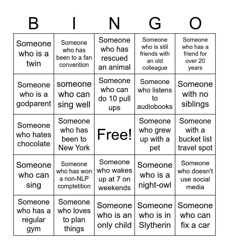 This bingo card has a free space and 107 words: Someone who has taken a foreign cooking class, Someone with a favourite mythology story, Someone who has been to New York, Someone who carries a lucky charm, Someone who likes doing puzzles, Someone with a favourite poem, Someone with a favourite quote, Someone who watches sports, Someone who does a sport, Someone born in September, Someone shorter than both their parents, Someone who cannot ride a bike, Someone who has watched an entire TV series in one weekend, Someone who has waited in line for a midnight release, Someone who has seen a musical, Someone who loves Taylor Swift, Someone who has been to a fan convention, Someone who has a movie they've seen more than 5 times, Someone who has been a volunteer for an event, Someone who is learning a new language, Someone who has won a non-NLP comptetition, Someone who baked bread during the pandemic, Someone who has made pasta from scratch, Someone who has attended a wine tasting, Someone who cannot roll their tongue, Someone who has a friend for over 20 years, Someone who is a godparent, Someone who is still friends with an old colleague, Someone who has attended more than 10 weddings, Someone who collects souvenirs, Someone who prefers not to plan trips, Someone who loves to plan things, Someone who learned a skill via Youtube, Someone who likes birdwatching, Someone who likes bees, Someone who has rescued an animal, Someone who hasnt watched a movie in over a year, Someone who saw a concert in the last month, Someone who is scared of clowns, Someone who can fix a car, Someone who knows how to make balloon animals, Someone who knows sign langage, Someone who is an only child, Someone who flys a lot, Someone who is scared of flights, someone who can sing well, Someone who can do 50 push ups, Someone who can do 10 pull ups, Someone who can write with both hands, Someone who grew up with a pet, Someone taller than both their parents, Someone with no siblings, Someone who can sing, Someone who is terrible at singing, Someone who likes pineapple on pizza, Someone who is good at pingpong, Someone who likes winter better than summer, Someone who is vegetarian or vegan, Someone who is left-handed, Someone who is a twin, Someone who prefers tea over coffee, Someone who prefers cats over dogs, Someone who changed careers, Someone who is the oldest sibling, Someone with a child, Someone with more than 3 siblings, Someone in a book club, Someone who doesn't use social media, Someone with over 4 hours of screen time a day, Someone who is a night-owl, Someone who wakes up at 7 on weekends, Someone who hates chocolate, Someone who is in Slytherin, Someone who has never watched `Harry Potter, Someone who dances, Someone who plays the piano, Someone who knits, Someone who can do a handstand, Someone who likes to play videogames, Someone who is a terrible cook, Someone who has met a celebrity, Someone who has seen a bear, Someone who has swum with dolphins, Someone who has been in a hot air balloon, Someone who has camped in a remote location, Someone who has gone snorkeling, Someone who took a flight in the last month, Someone who has built their own computer, Someone who has fixed their own bicycle, Someone who, at some point, has made a blog, Someone who listens to audiobooks, Someone who listens to vinyl records, Someone who has taken a Coursera course, Someone with a cute pet, Someone with over 500 followers on a social media platform, Someone with an allergy, Someone who has a regular gym, Someone who tracks their daily steps, Someone interested in sustainability, Someone who has been to at least 4 continents, Someone who likes to travel alone, Someone who has an upcoming vacation planned, Someone who likes to ski, Someone who cannot drive, Someone who cannot tell their right from their left, Someone with a bucket list travel spot and Someone who took a history course for fun.