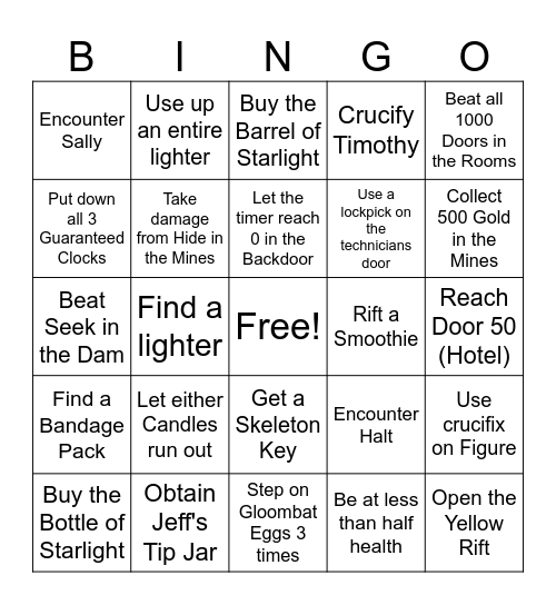This bingo card has a free space and 149 words: Encounter Rush, Encounter Dread, Encounter Screech, Encounter Eyes (Entity), Encounter a room with Dupe, Encounter Halt, Encounter Ambush, Encounter Timothy, Encounter Jack, Encounter Shadow, Get 500 Coins, Get 1000 Coins, Get 750 Coins, Fill Jeff's Tip Jar, Buy all of Jeff's stock, Use a crucifix, Use crucifix on Rush, Use crucifix on Dread, Use crucifix on Screech, Use crucifix on Eyes, Use crucifix on Dupe, Use crucifix on Figure, Use crucifix on Seek, Use crucifix on Halt, Use crucifix on Ambush, Find a lighter, Use up an entire lighter, Find a candle, Find a crucifix, Find a flashlight, Use the herbs, Beat the Hotel, Finish with 200 or more knobs, Reach Door 50 (Hotel), Reach Door 100 (Hotel), Finish First Seek Chase (Hotel), Finish Second Seek Chase (Hotel), Collect all books in the library, Use a lockpick on the technicians door, Open a locked chest, Find a lockpick, Enter the Rooms, Get a Skeleton Key, Get pushed out of a closet by Hide, Have 3 lockpicks at once, Have 3 vitamins at once, Find a vitamin, Have Figure destroy both alarm clocks (Hotel), Finish the painting room, Finish the Backdoor, Have 3 Vials of Starlight, Reach Door -25 (Backdoor), Buy the Bottle of Starlight, Hide in plain sight from Rush or Ambush, Use a Vial of Starlight in the Hotel, Consume 5 Bandages, Consume 3 Batteries, Hide in Plain Sight, Buy the Shakelight, Fill Jeff's Tip Jar 3 Times in 1 run, Beat all 1000 Doors in the Rooms, Buy the Barrel of Starlight, Step on a snare 3 times in one run, Take an early exit in the Rooms, Survive 1 hit of A-90, Rift a Candle, Rift a Smoothie, Rift any item, Rift a Starlight item, Use a Vial of Starlight in the Mines, Use a lockpick on a generator, Spawn Dread, Find a Firedamp room, Encounter Sally, Find a Glitch Core, Throw a Glowstick at a Giggle, Find Shears, Have 10 Glowsticks at once, Find a Bandage Pack, Find a Battery Pack, Find a Bulklight, Find a Straplight, Crucify Timothy, Open all of the Drawers in the Library, Trade with Louie, Crucify Louie, Collect 500 Gold in the Mines, Collect 100 Gold in the Backdoor, Leave the Rooms with at least 1,300 Gold, Look at the Lookman twice, Step on Gloombat Eggs 3 times, Be at less than half health, Encounter Gloombats, Encounter Giggle, Complete the Grumble Nest, Finish Both Figure rooms in the Mines, Finish Figure Generator Room, Finish Figure room after he drops down, Finish Seek Jumping 1 in the Mines, Finish Seek Minecart, Beat Seek in the Dam, Encounter Blitz, Encounter A-90, Encounter A-60, Encounter A-120, Hide from a Grumble in plain sight, Locate the Queen Grumble during the Node Search, Use a Crucifix on Queen Grumble, Use a Crucifix on Giggle, Use a Crucifix on Grumble, Use a Crucifix on Gloombats, Encounter the Lookman, Let the timer reach 0 in the Backdoor, Consume either Bread, Cheese, or Gween Soda, Use a Crucifix on Hide, Take damage from Hide in the Mines, Let either Candles run out, Put down all 3 Guaranteed Clocks, Open a locked Chest or Locker, Find a Smoothie, Open the Yellow Rift, Kill Yourself via Candies, Not Five Stars, Beat Door 200, Die to a Mines Entity in the Hotel, Die to a Backdoor Entity in the Hotel, Die to a Backdoor Entity in the Mines, Find a Skeleton Key door randomly, Die to Hide, Encounter Groundskeeper, Encounter Mandrake, Encounter Monument, Encounter Bramble, Finish the Outdoors, Obtain a Lotus Flower, Fully use up a Skeleton Key, Have Groundskeeper Destroy a Mandrake, Encounter Eyestalk, Finish Eyestalk's Chase, Finish World Lotus, Obtain Compass, Obtain Lantern, Obtain Bread, Obtain Jeff's Tip Jar, Obtain Rift Jar, Obtain Multitool, Obtain Aloe, Obtain Donut and Steal a Painting.