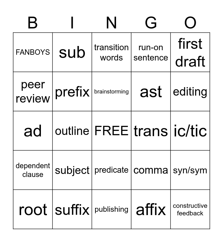 This bingo card has a free space and 29 words: root, in, outline, gen, FANBOYS, transition words, prefix, subject, trans, suffix, ic/tic, constructive feedback, publishing, affix, editing, path, predicate, dependent clause, first draft, ad, comma, independent clause, ast, peer review, run-on sentence, sub, syn/sym, brainstorming and ology.