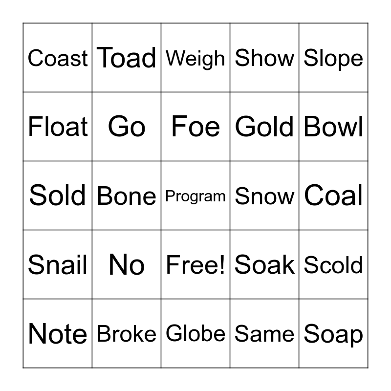 This bingo card has 26 words: Free!, Same, Foe, Broke, Slope, Coast, Float, Toad, Coal, Soak, Gold, Sold, Scold, Note, Bone, Slow, Show, Snail, Weigh, Program, Bowl, Globe, Snow, No, Go and Soap.