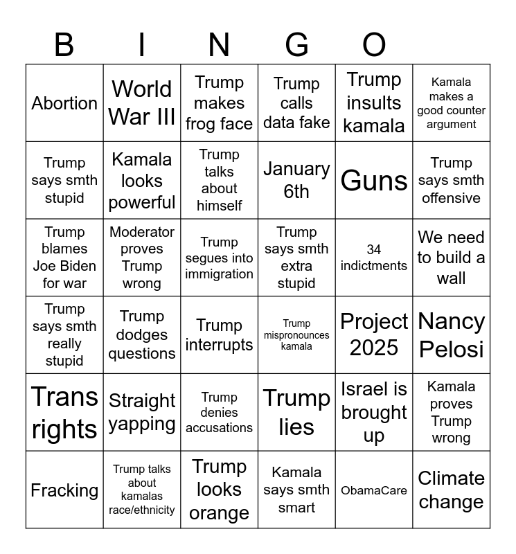 This bingo card has 36 words: Trump lies, Trump denies accusations, Kamala says smth smart, Trump says smth stupid, Trump says smth really stupid, Trump says smth extra stupid, Kamala looks powerful, Trump looks orange, Trump insults kamala, Israel is brought up, Trump says smth offensive, Trump calls data fake, Kamala proves Trump wrong, Moderator proves Trump wrong, January 6th, Abortion, Trans rights, 34 indictments, Trump blames Joe Biden for war, Trump makes frog face, Trump segues into immigration, Trump dodges questions, Trump mispronounces kamala, Trump interrupts, Project 2025, World War III, Guns, Trump talks about kamalas race/ethnicity, Trump talks about himself, Kamala makes a good counter argument, Climate change, Fracking, Nancy Pelosi, We need to build a wall, Straight yapping and ObamaCare.