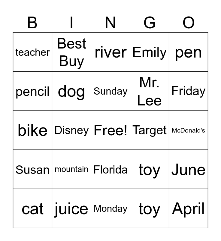 This bingo card has a free space and 57 words: New York, cat, Walmart, teacher, Monday, Sarah, dog, school, Mr. Lee, book, Emily, park, Tom, apple, museum, McDonald's, pen, Disney, library, April, Target, Chicago, toy, river, Los Angeles, Sunday, Mr. Smith, zoo, Friday, Mrs. Brown, hospital, Target, Starbucks, Chicago, McDonald's, pencil, Washington, bike, George, Susan, Best Buy, Florida, Amazon, ocean, desk, Harry, mountain, juice, Subway, Denver, Sam, toy, hospital, Los Angeles, Mr. Smith, June and subway.