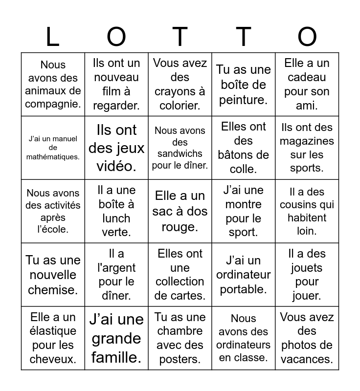 This bingo card has 30 words: J’ai une grande famille., Tu as un projet pour l’école., Il a une boîte à lunch verte., Elle a un livre de science., Nous avons des animaux de compagnie., Vous avez des crayons à colorier., Ils ont des jeux vidéo., Elles ont une collection de cartes., J’ai une montre pour le sport., Tu as une chambre avec des posters., Il a des cousins qui habitent loin., Elle a un sac à dos rouge., Nous avons des ordinateurs en classe., Vous avez des photos de vacances., Ils ont des magazines sur les sports., Elles ont des chaussures de sport., J’ai un ordinateur portable., Tu as une nouvelle chemise., Il a l'argent pour le dîner., Elle a un cadeau pour son ami., Nous avons des activités après l’école., Vous avez les jeux de société., Ils ont un nouveau film à regarder., Elles ont des bâtons de colle., J’ai un manuel de mathématiques., Tu as une boîte de peinture., Il a des jouets pour jouer., Elle a un élastique pour les cheveux., Nous avons des sandwichs pour le dîner. and Vous avez un livre..
