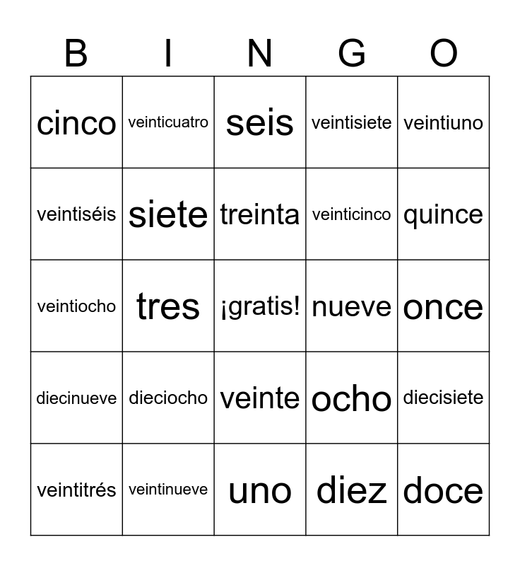This bingo card has a free space and 31 words: uno, dos, tres, cuatro, cinco, seis, siete, ocho, nueve, diez, once, doce, trece, catorce, quince, dieciséis, diecisiete, dieciocho, diecinueve, veinte, veintiuno, veintidós, veintitrés, veinticuatro, veinticinco, veintiséis, veintisiete, veintiocho, veintinueve, treinta and treinta y uno.
