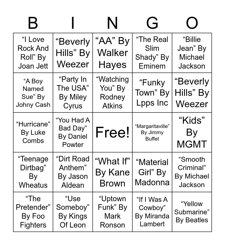 This bingo card has a free space and 24 words: “Dirt Road Anthem” By Jason Aldean, “Use Someboy” By Kings Of Leon, “Watching You” By Rodney Atkins, “The Pretender” By Foo Fighters, “Billie Jean” By Michael Jackson, “I Love Rock And Roll” By Joan Jett, “A Boy Named Sue” By Johny Cash, “Beverly Hills” By Weezer, “Margaritaville” By Jimmy Buffet, “What If” By Kane Brown, “Funky Town” By Lpps Inc, “Hurricane” By Luke Combs, “Material Girl” By Madonna, “Smooth Criminal” By Michael Jackson, “Party In The USA” By Miley Cyrus, “If I Was A Cowboy” By Miranda Lambert, “Kids” By MGMT, “AA” By Walker Hayes, “Beverly Hills” By Weezer, “You Had A Bad Day” By Daniel Powter, “Yellow Submarine” By Beatles, “Teenage Dirtbag” By Wheatus, “The Real Slim Shady” By Eminem and “Uptown Funk” By Mark Ronson.